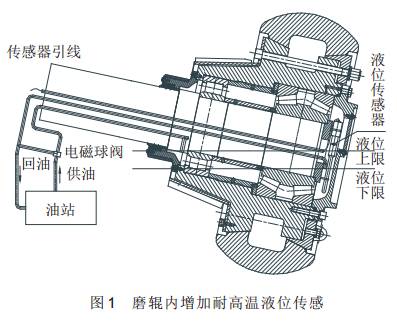 為此,在磨輥密封和磨輥潤滑系統(tǒng)很難有效改進的情況下,我公司從控制磨輥內(nèi)油位入手,在磨輥內(nèi)增加了一個耐高溫的液位傳感器,見圖1。達到了很好的效果。安裝在磨輥軸承壓蓋上的液位傳感器引線從磨輥軸中引出,并在油站供油管路上增加了一個三通的電磁球閥,常開點與磨輥供油管路相連,常閉點與回油管路相連。
