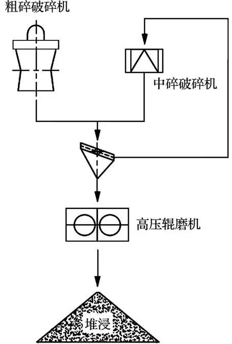 圖1 所示為高壓輥磨機常用的兩種堆浸工藝。高壓輥磨產品分為邊料和中心料,邊料粒度相對較粗,產生的微裂紋較少。高壓輥磨機開路工藝回收率較邊料返回工藝低,但前者的工藝流程簡單,設備規格相對較小,投資與運行成本較低。