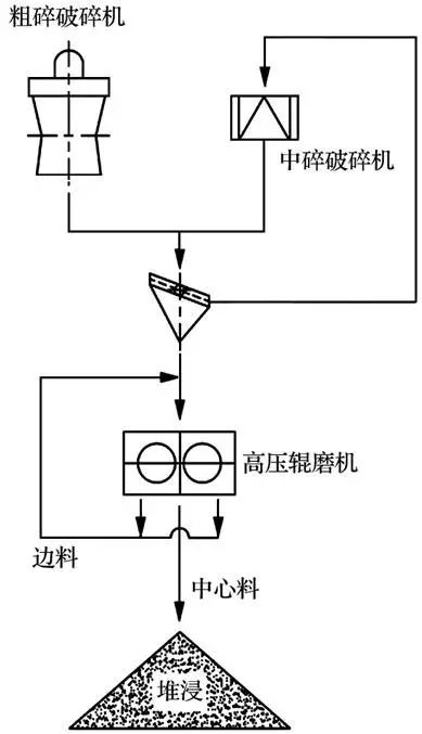 高壓輥磨機邊料返回破碎工藝是指高壓輥磨中間產品直接進入下道作業工序,邊料再返回高壓輥磨機再次破碎的工藝。輥壓后中間產品可以直接進入球磨機磨礦,也可以先進行分級,粗粒產品進入球磨機磨礦。此工藝在輥壓產品細粉含量較高時優勢明顯。