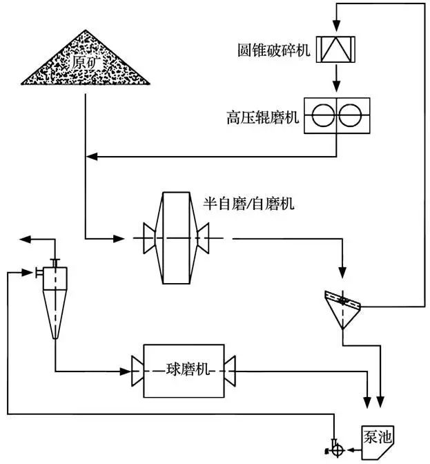 如果高壓輥磨機在第 3 段破碎機之后作為超細碎設備,可以稱為準磨礦工藝,粒度上接近自磨/半自磨磨礦效果,能滿足常規粗磨后提前拋尾作業對物料粒度、解離度等特性的要求,與濕式粗粒拋尾聯合使用,可顯著減少后續入磨礦量,提高系統產能。